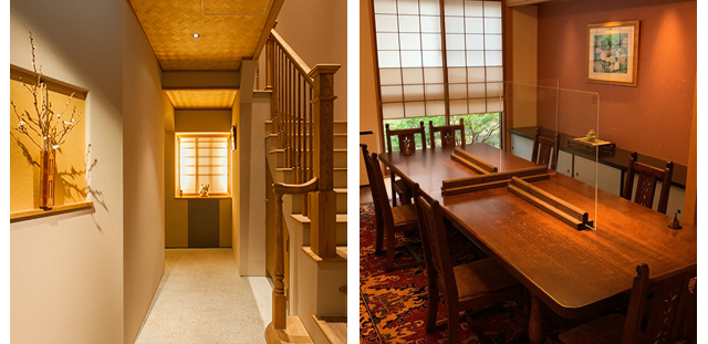 二階席には大正ロマンをイメージしたモダンな個室をご用意しております。イスとテーブルを設えた個室は、祝席やお仲間とのご会食などに、会話がはずむ和やかな雰囲気です。プライベートの多様なシーンにご対応いたします。